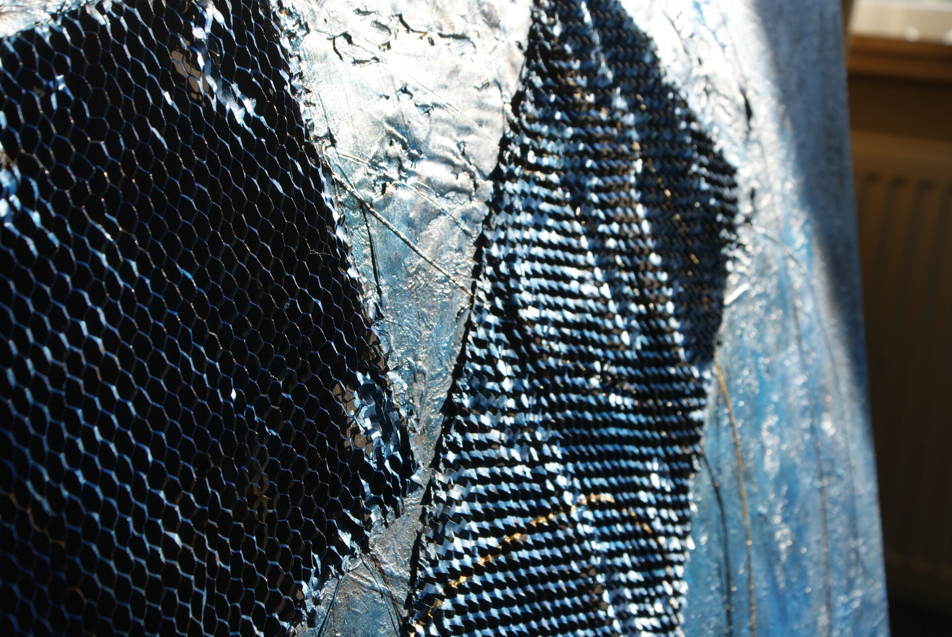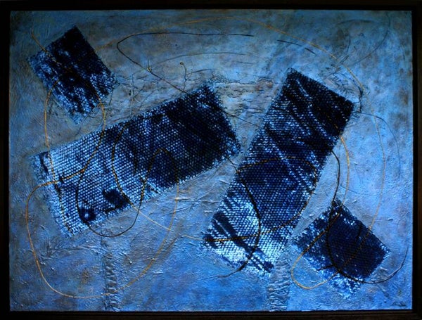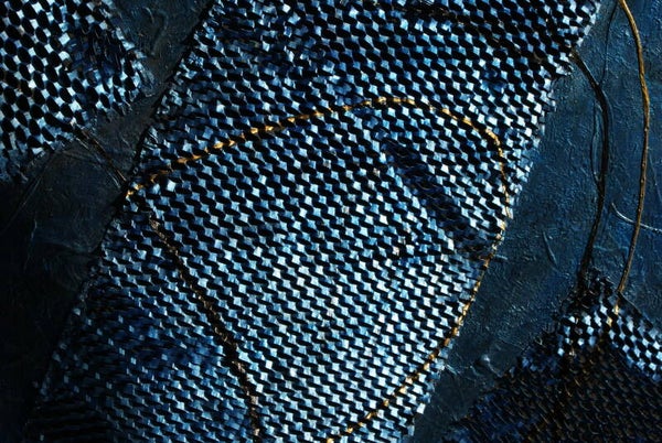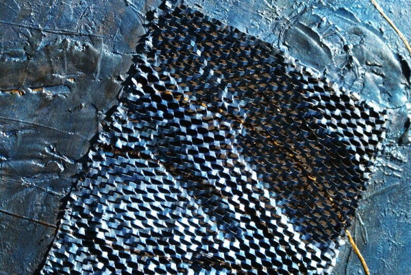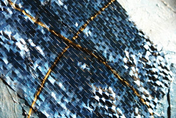 Ein tiefes Blau in dunklen Schattierungen, mit goldenen Linien und Kupferdraht hinter schuppenartigen Einsätzen.