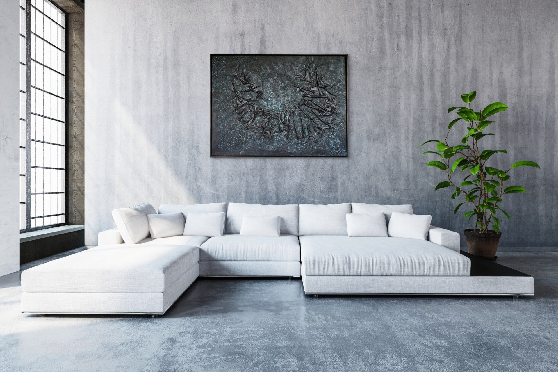 Wie eine dunkle Bergkette von oben, türkisfarbene Punkte setzen funkelnde Akzente und bringen das Bild zum Leuchten. Die 3D-Optik aus Stoff modelliert und mit Acrylfarben coloriert, erzeugt einen einzigartigen Effekt.